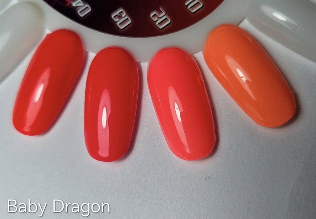 Gel lak Baby Dragon je středně pigmentovaný, třífázový gel lak se střední hustotou, který poskytuje dokonalé krytí ve dvou vrstvách. Kolekce obsahuje čtyři zářivé odstíny – od neonově dětské růžové až po ohnivě červenou. Tyto barvy září nejen v létě, ale také pod UV světlem – ideální, pokud toužíš po opravdu nápadné manikúře!