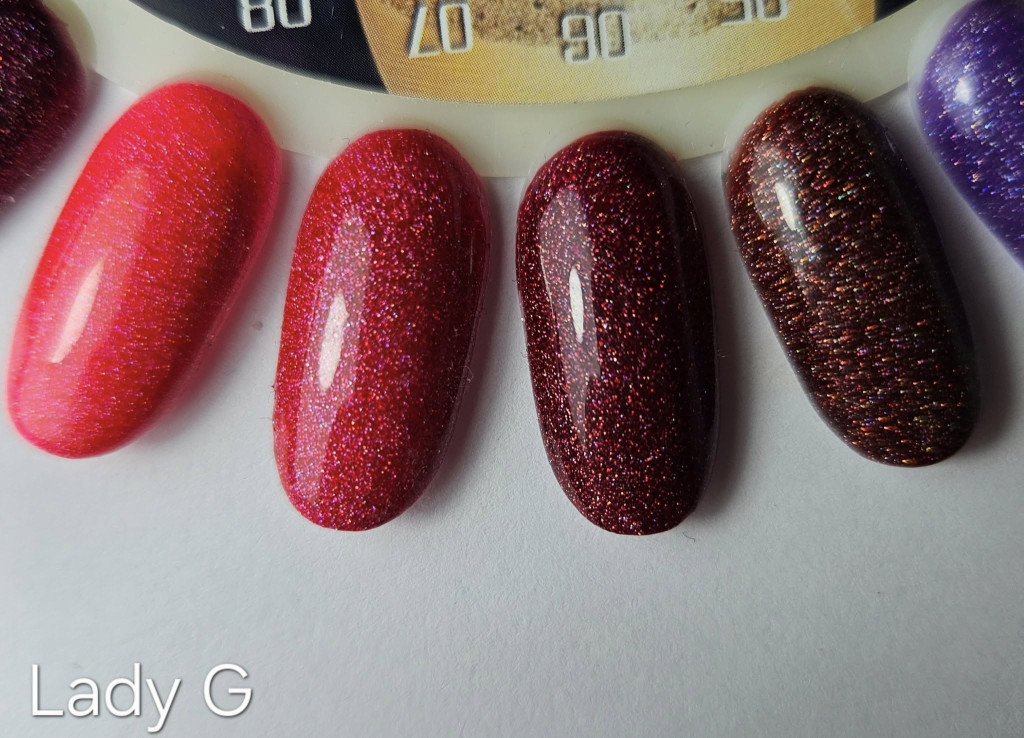 Lady G gelový lak je středně pigmentovaný, 3krokový a středně hustý gelový lak, který ve dvou vrstvách poskytuje vysokou odolnost proti opotřebení. Použitím potěšíte milovníky třpytivých nehtů.